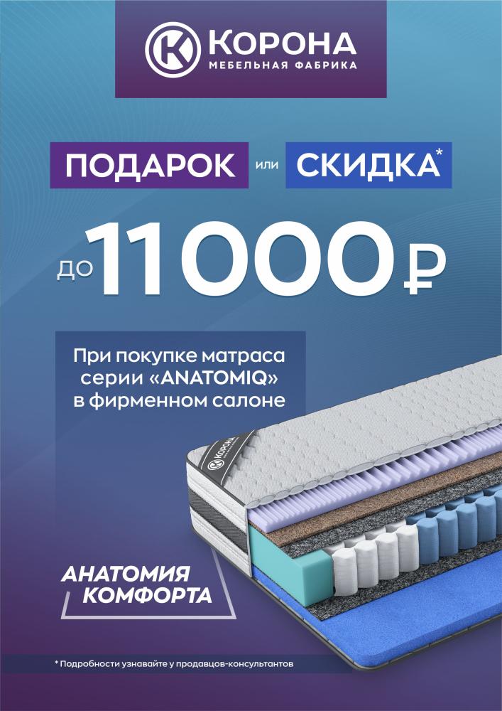 При покупке матраса из серии «Anatomiq» действует акция: подарки до 11 000 р. или скидка на следующий товар ТМ «Корона» в этом же чеке с 01.11.2025 - 30.11.2025г.